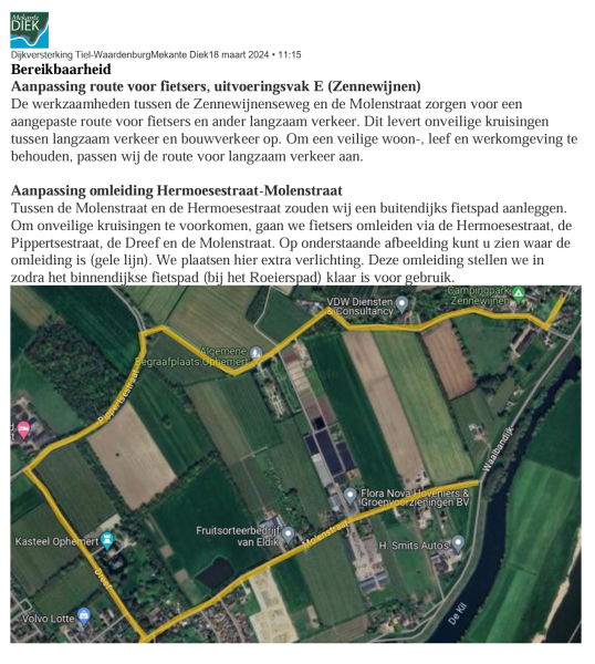 We gaan kabels en leidingen verleggen bij de dijkopgang Grotestraat naar de Waalbandijk. Om veilig te kunnen werken, sluiten we de kruising kruising Grotestraat – Waalbandijk af vanaf 22 april tot en met 26 april. Bedrijven en woningen aan de Grotestraat blijven gewoon bereikbaar. Verkeer kan omrijden via de Donkerstraat of de Kerkstraat.